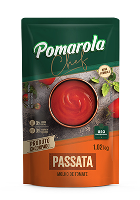 A Passata de tomate Pomarola Chef não possui adição de açúcar ou sal, é só tomate e nada mais. Perfeita para você dar o seu toque de chef!
